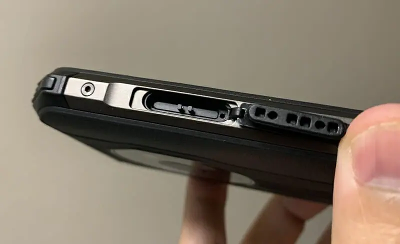 ▼ポートはキャップでかなり強くカバーされており、結構な力を入れないと外せないほど。水没時でも端子に水が浸入するのを防いでくれる。