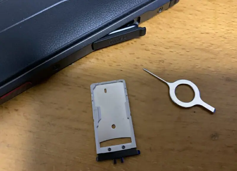 ▼付属のピンを用いることでカードスロットを取り出し、SIMカードやマイクロSDカードの挿入が可能となる。