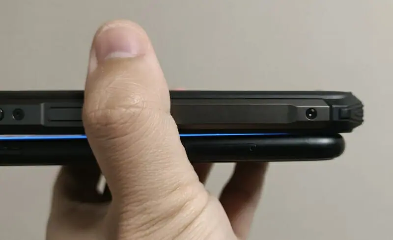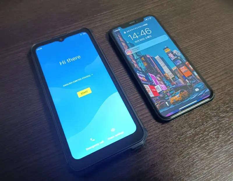 ▼iPhone XR(右)と並べた様子。『OUKITEL WP13』の本体サイズは176mm×85.2mm×14.5 mmと、iPhone XRより一回り大きい。