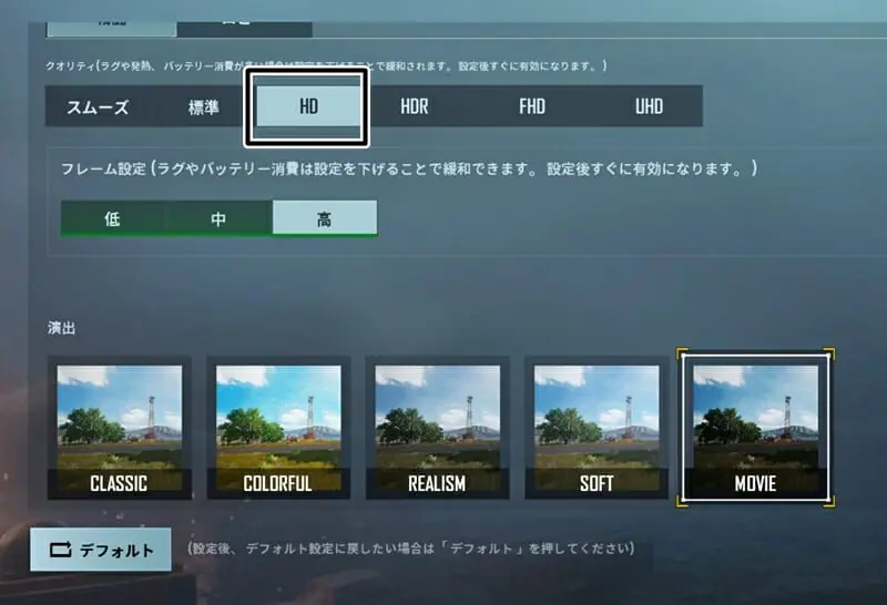 まずグラフィッククオリティに関しては『HD』までを選択することが出来た。
