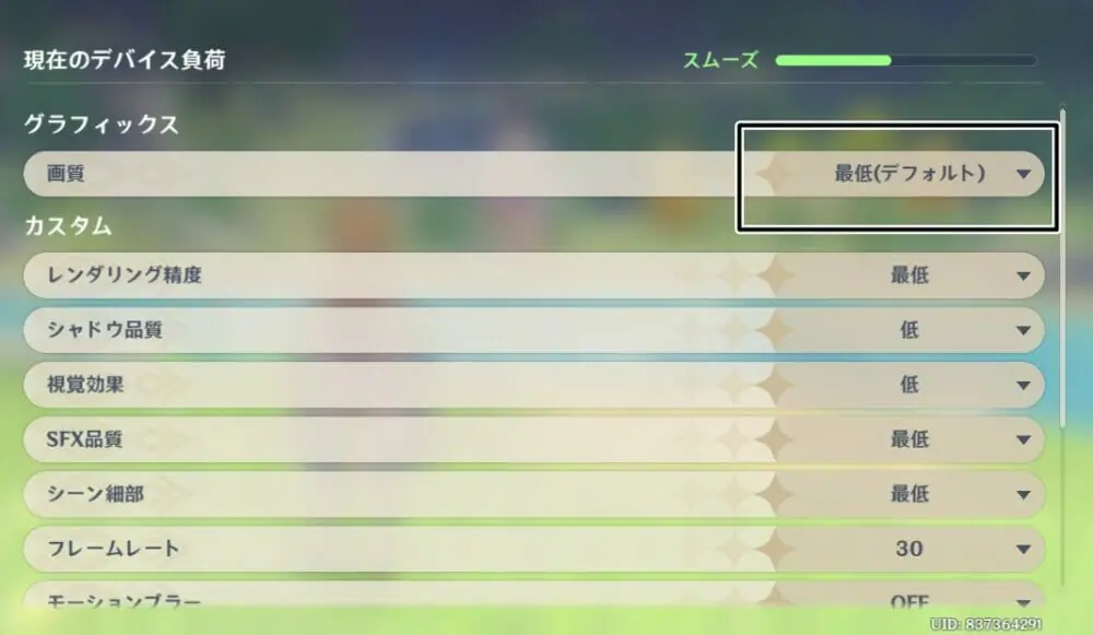 正直言って、画質が "最低" と "低" とのあいだでそこまで差が感じられないため、無理に画質設定を上げる必要は無いように感じた。