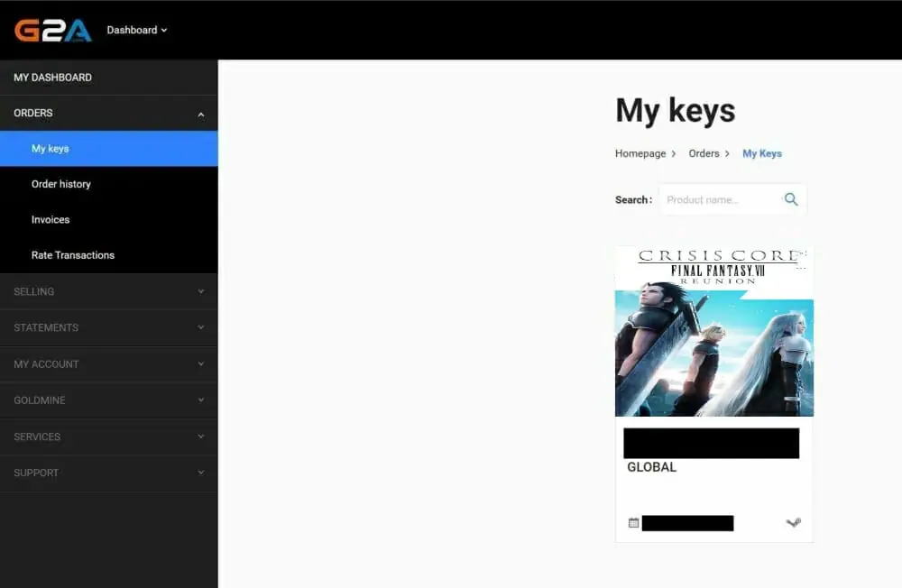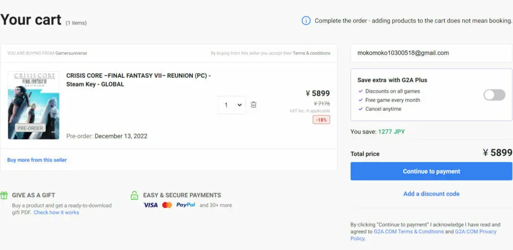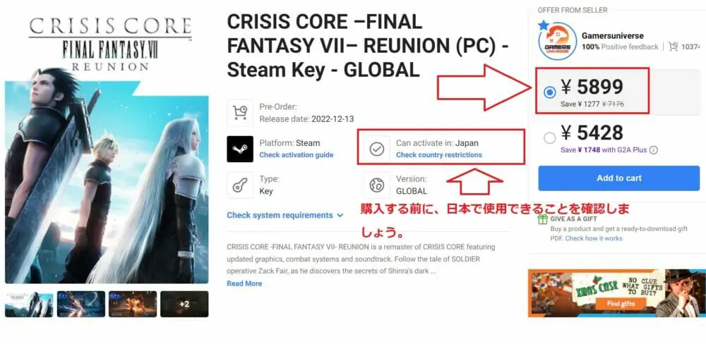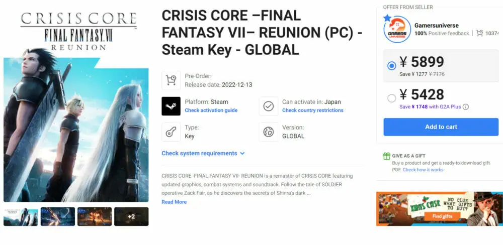 外部ストア『G2A』でCCFFVII リユニオンを購入