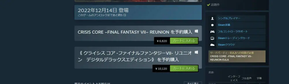 上部検索欄に「CRISIS CORE –FINAL FANTASY VII– REUNION」と入力して検索し、作品のページにアクセスします。