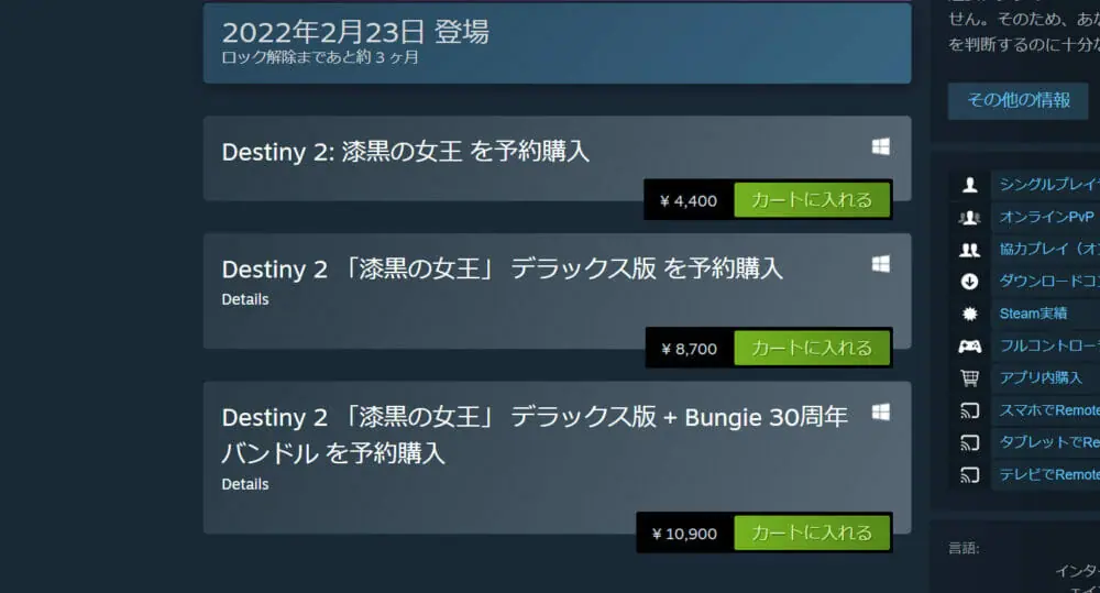 ※Destiny 2: The Witch Queen(漆黒の女王)をプレイするには「Destiny 2」がSteam上に必要です。