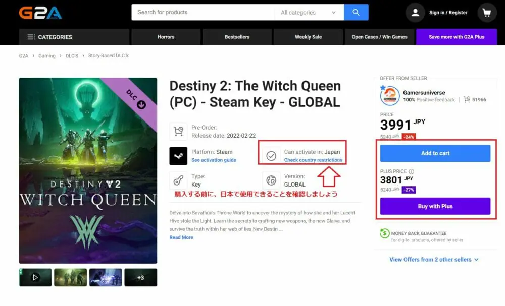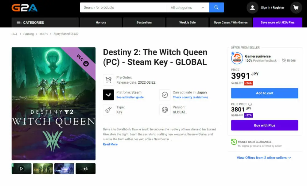 Destiny 2: The Witch Queen(漆黒の女王)を安く購入するには、『G2A』(G2A.COM Limited)という海外のゲーム購入サイトを利用します。