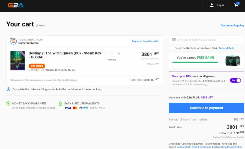 『G2A』におけるDestiny 2: The Witch Queen(漆黒の女王)の販売価格は以下の通りです。