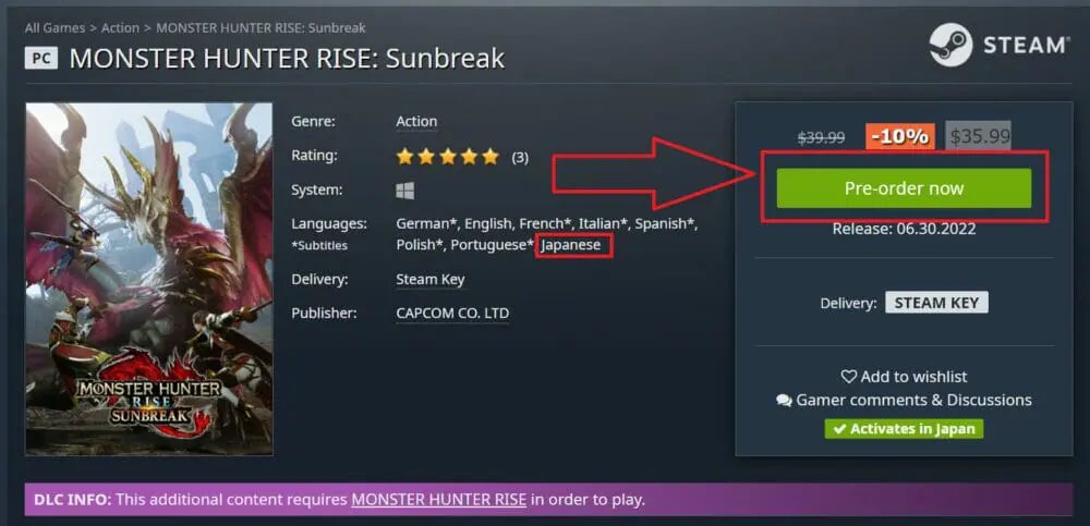 モンハンライズ:サンブレイクの購入ページに飛んだら、一応「Languages(対応する言語)」にJapaneseがあることを確認したうえで、「Add to Cart」をクリックしてください。