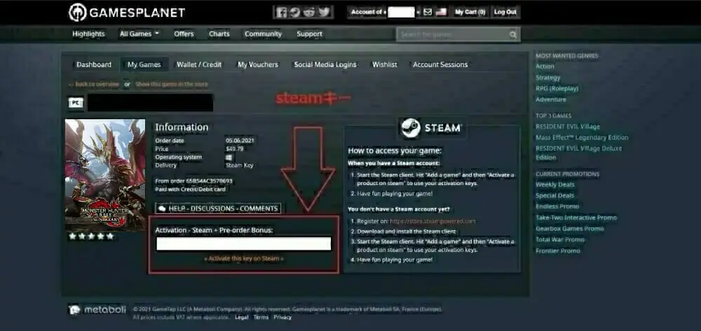 ▼ゲーム購入後は、アカウントの「My Games」から、"Steamキー" を確認することができます。