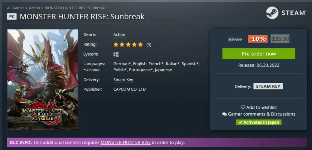 ※MONSTER HUNTER RISE: Sunbreakをプレイするには「MONSTER HUNTER RISE」がSteam上に必要です。