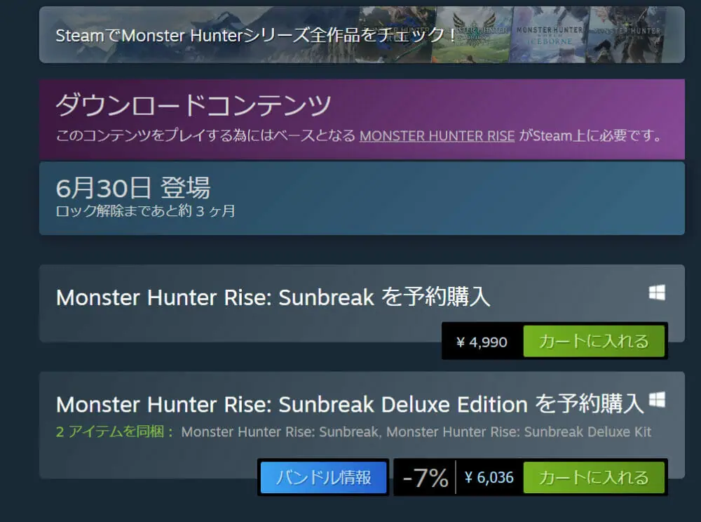 上部検索欄に「MONSTER HUNTER RISE: Sunbreak」と入力して検索し、作品のページにアクセスします。