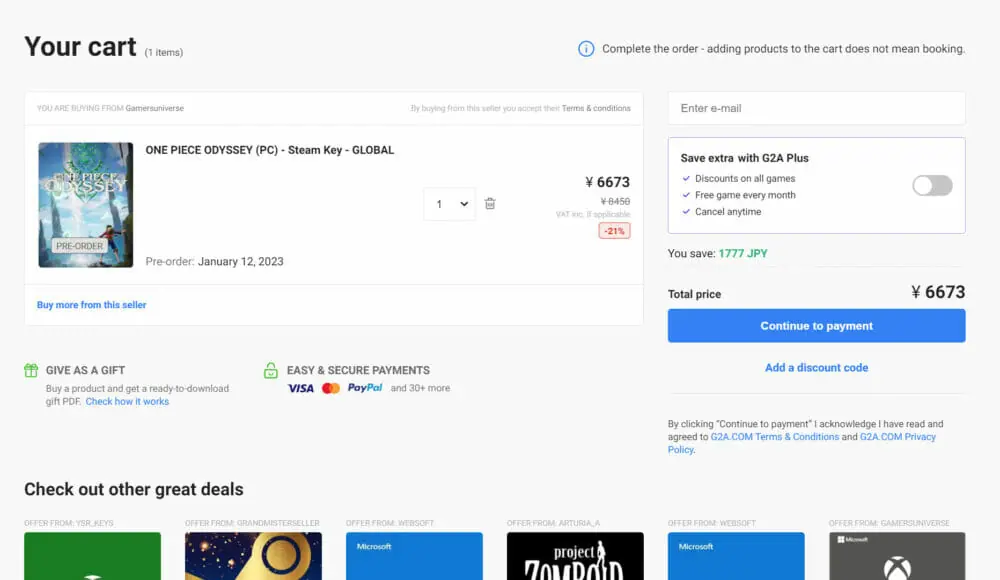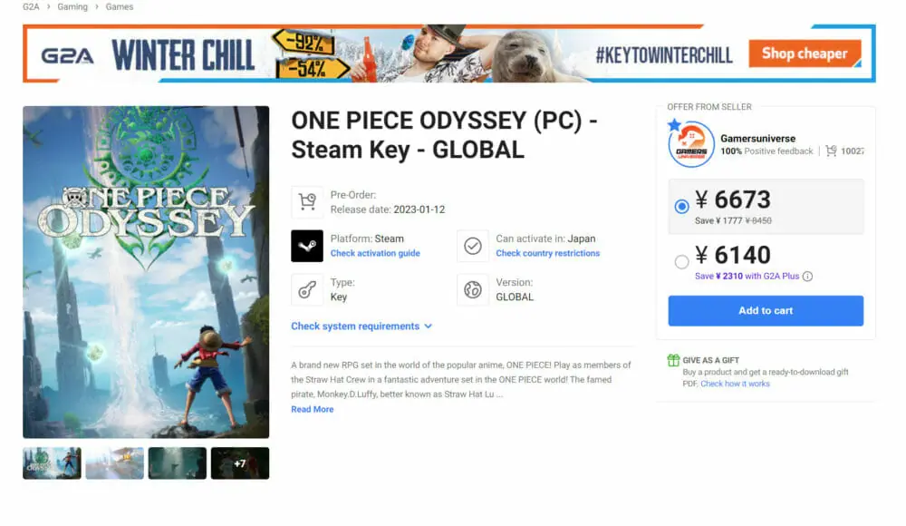 『G2A』におけるワンピース オデッセイの販売価格は以下の通りです。