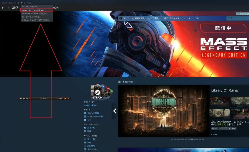 ▼steamのサイト左上の、ゲームタブ内の「steamでアイテムを有効化する」をクリックしてください。
