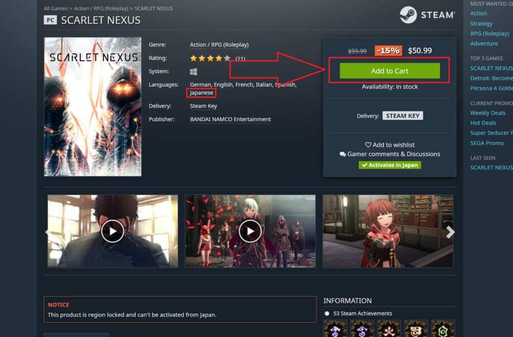 「スカーレットネクサス」の購入ページに飛んだら、一応「Languages(対応する言語)」にJapaneseがあることを確認したうえで、「Add to Cart」をクリックしてください。