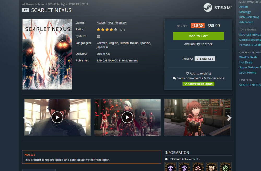 『Gamesplanet』におけるスカーレットネクサスの販売価格は以下の通りです。