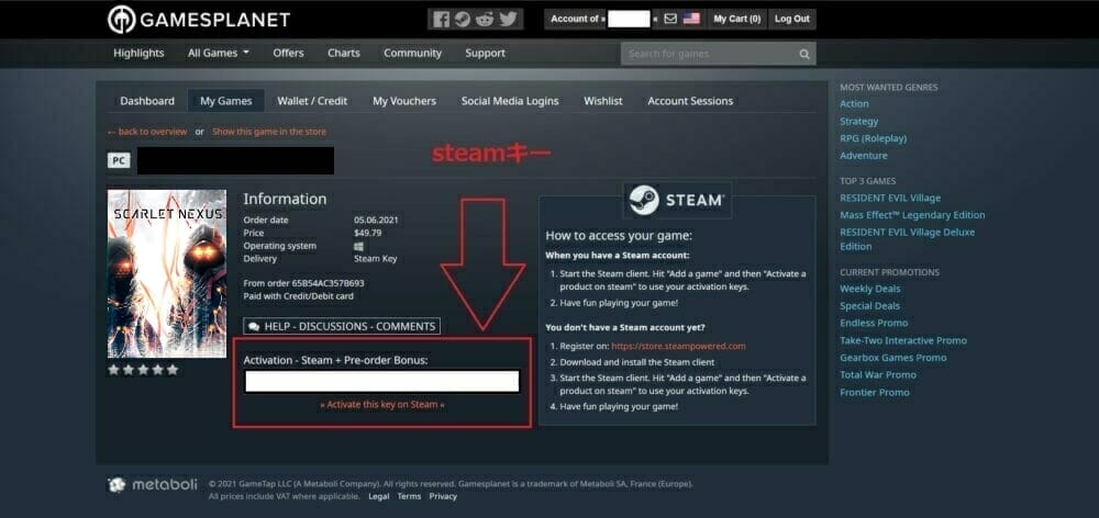 Gamesplanetでは、Steamで使用することができる "ゲームキー" を、通常よりも安い価格で購入することができます。