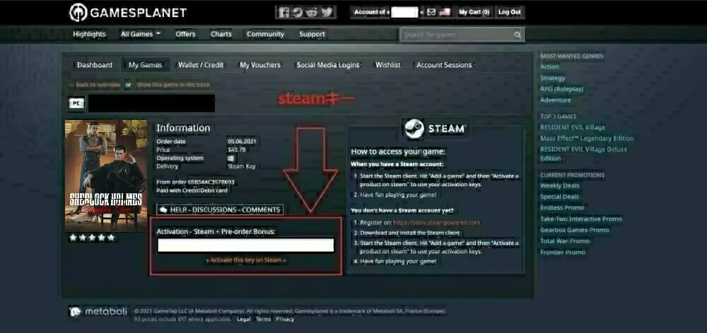 ▼製品を有効化するページが出てくるので、Gamesplanetで購入した、steamキーを入力してゲームを入手しましょう。