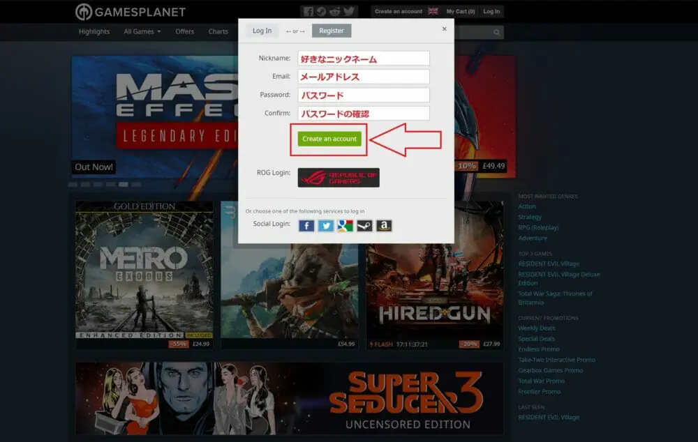 PC版『The Ascent』を購入するには、まず最初に『Gamesplanet』でアカウントを作成(無料)する必要があります。
