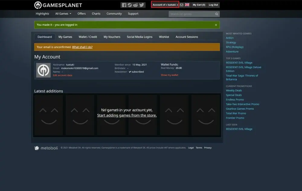 ▼または登録したメールアドレスに、gamesplanetから「My Games」に飛べるメールが届いてます。