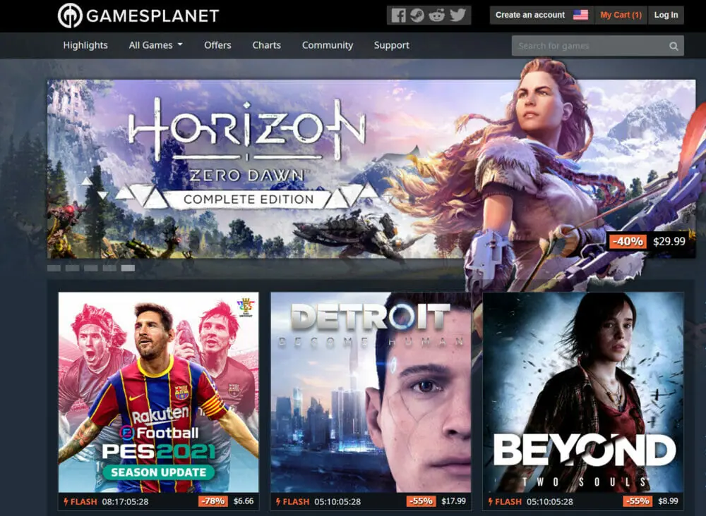 まず下記のリンクをクリックしてGamesplanetにアクセスし、画面上部にある「Create an account」をクリックしてください。