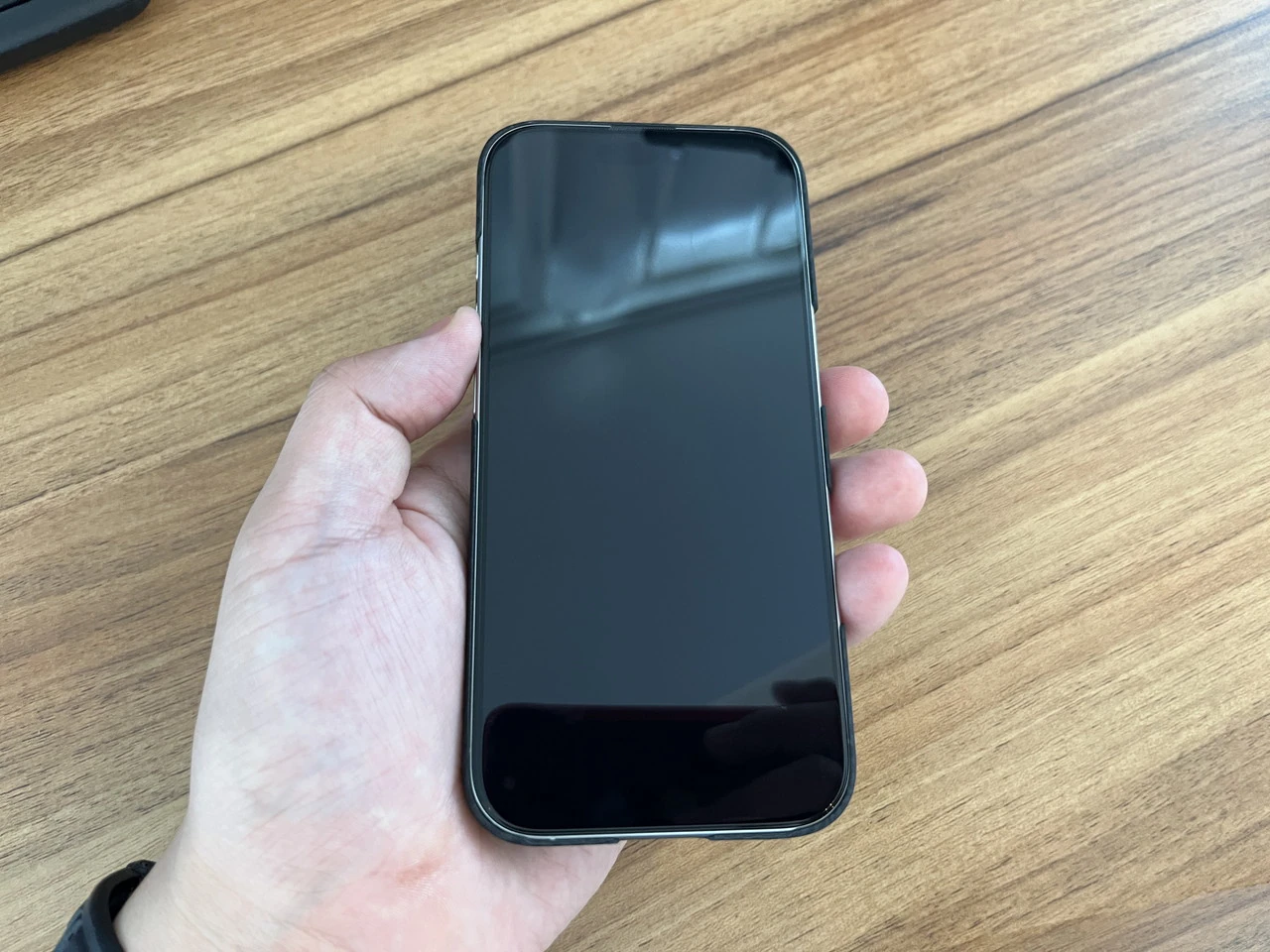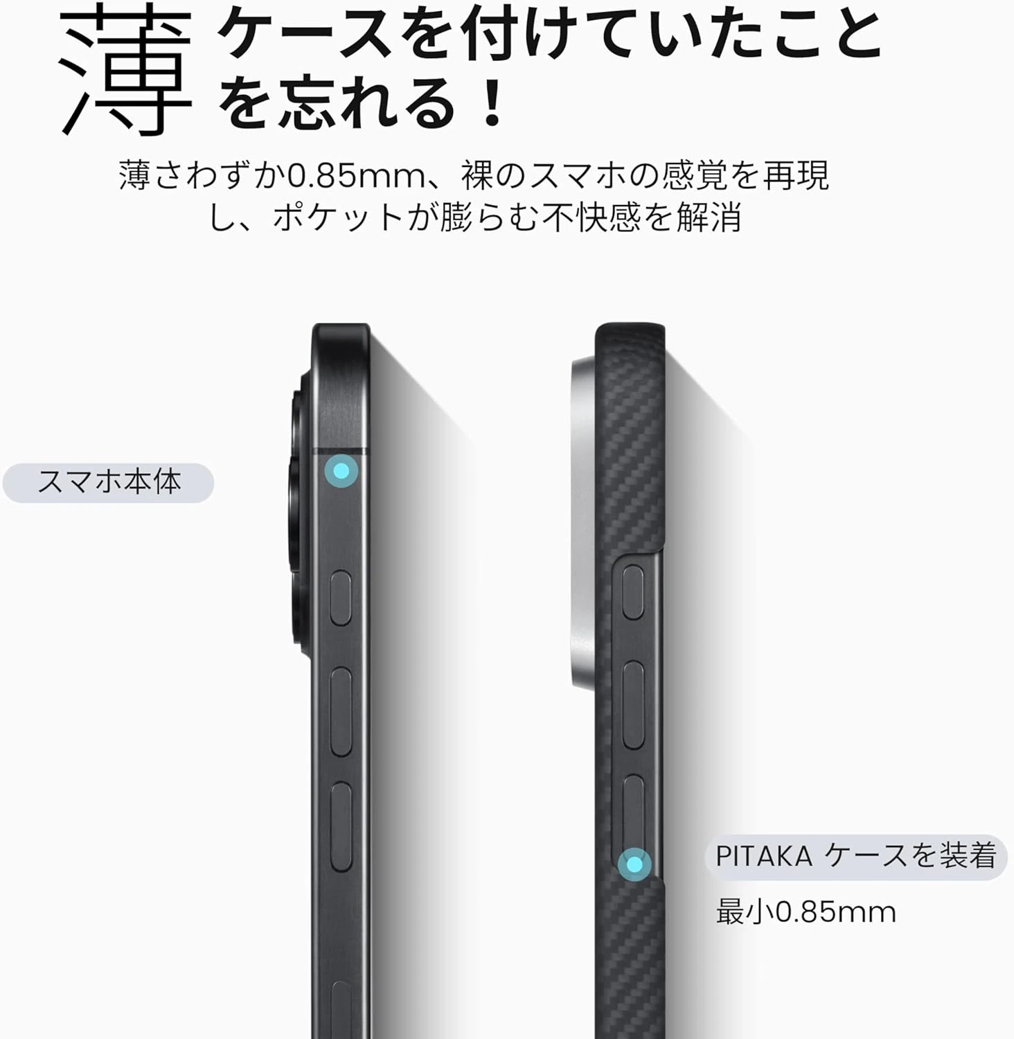 極薄ケースは最薄部で0.85mmと非常に薄いため、iPhone 16 Proに装着しても、手に持った時のサイズ感がほとんど変わらない。