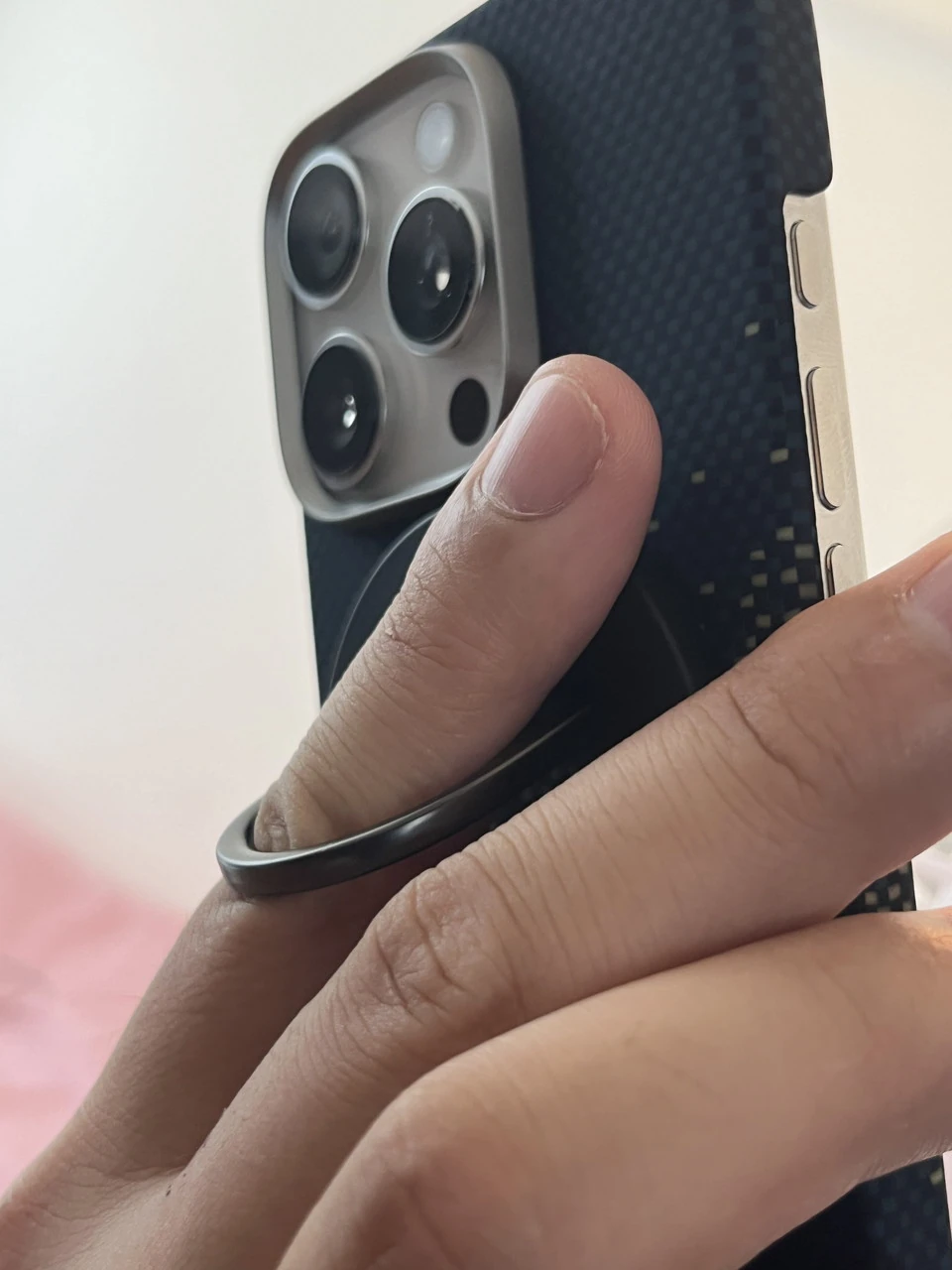 MagEZ Gripはアラミド繊維と金属の組み合わせでデザインされており、高級感は抜群。デザイン的にも、PITAKAスマホケースに完全にマッチする。