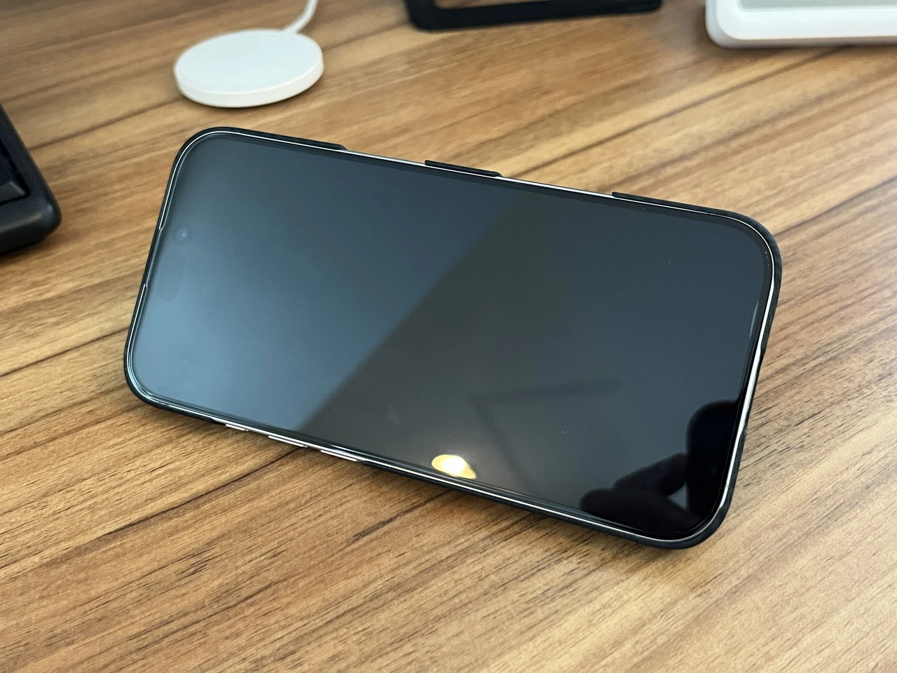 ▼MagSafe対応のワイヤレス充電器がスマホケース背面へ強力に吸着する。