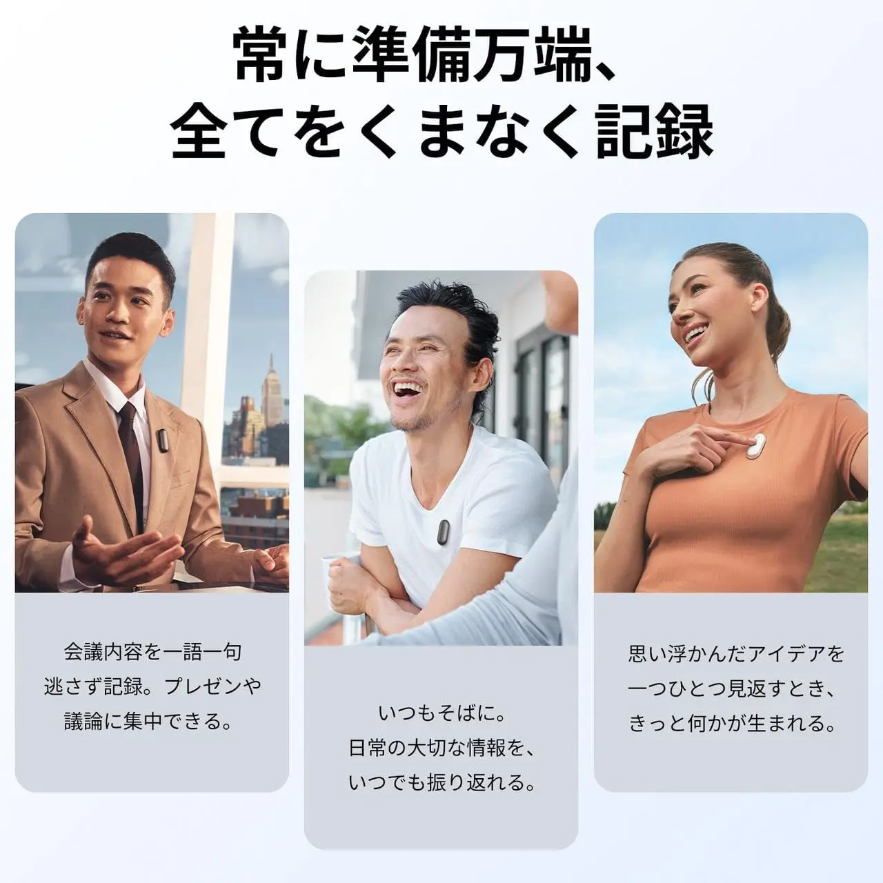 胸元に装着できる超小型・軽量のウェアラブルAIボイスレコーダーです。指でつまめるほどのカプセル型デザインで、ビジネスから日常まで、違和感なく使えるスタイリッシュさが魅力的。マグネットピンやクリップでしっかり固定でき、手ぶらで自然な録音が可能です。