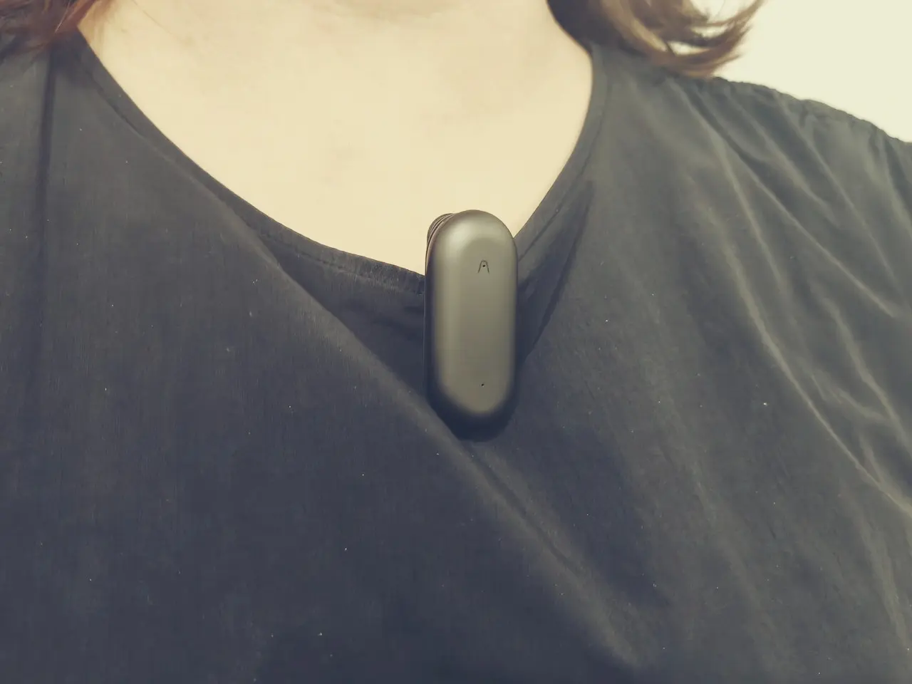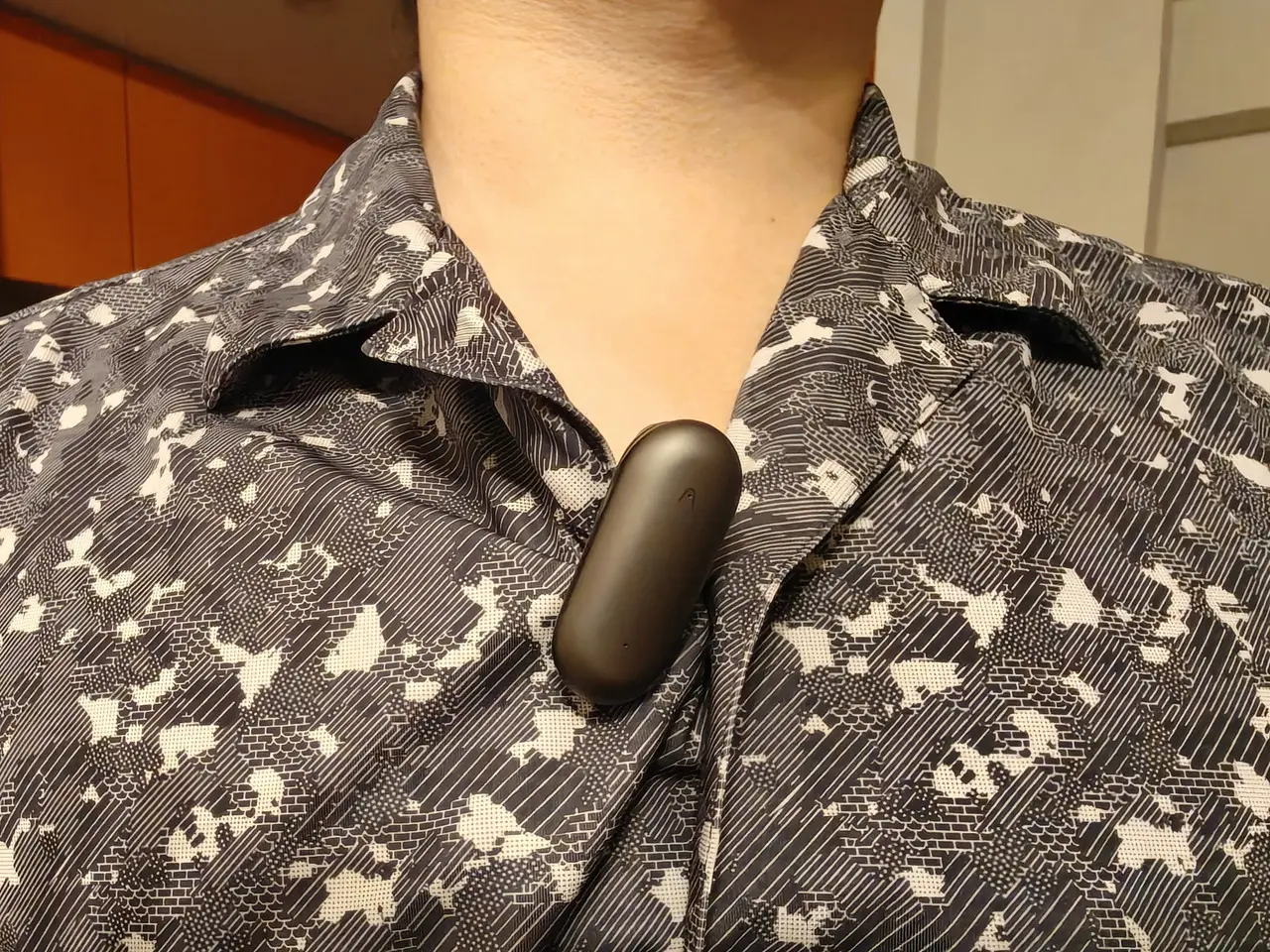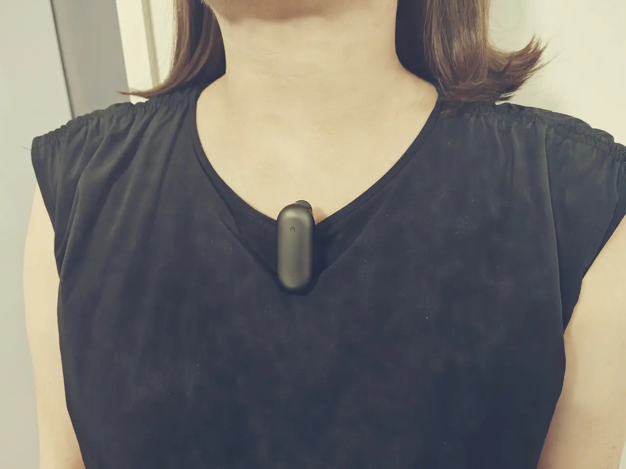 PLAUD NotePinは様々な方法で身に着けることができますが、今回のレビュー時には付属のクリップを利用して、服に装着して使用しました。