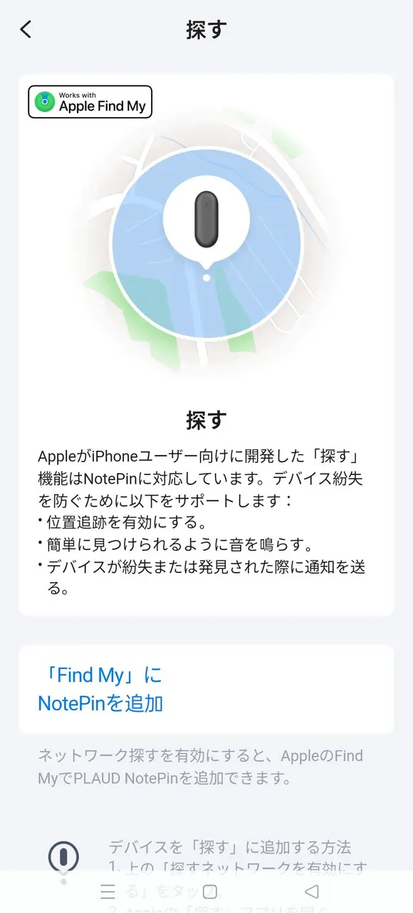 ▼iPhoneと連携した場合は「探す」機能も利用可能。PLAUD NotePinを紛失または発見した場合に、通知を受け取ることができます。