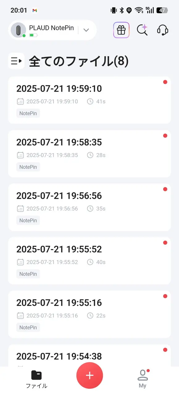 録音が完了すると、音声データがPLAUD NotePinの内蔵ストレージに保存され、アプリ上に一覧で表示されます。