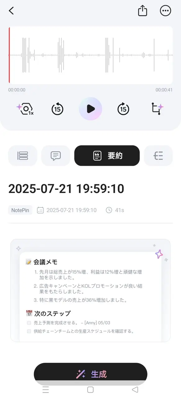 録音後は、Microsoft Azureによる112カ国語対応の文字起こしと、最先端の大規模言語モデル(LLM)による要約生成が可能。複雑な内容も自動で整理され、すぐに読みやすいメモとして残すことができます。
