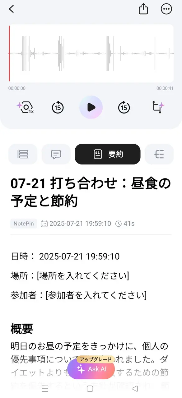 会話内容と、PLAUD NotePinが要約した内容を比べてみます。