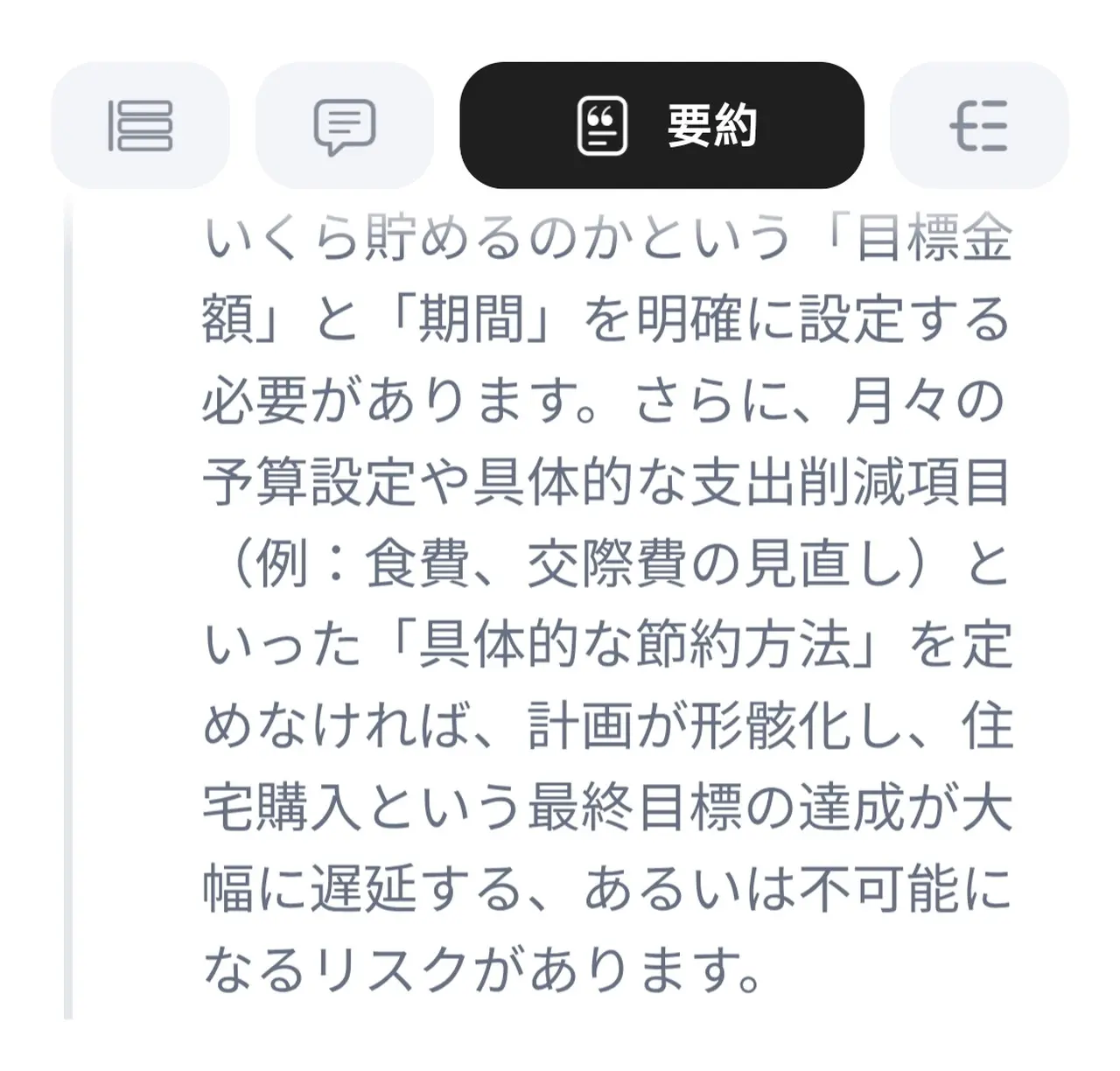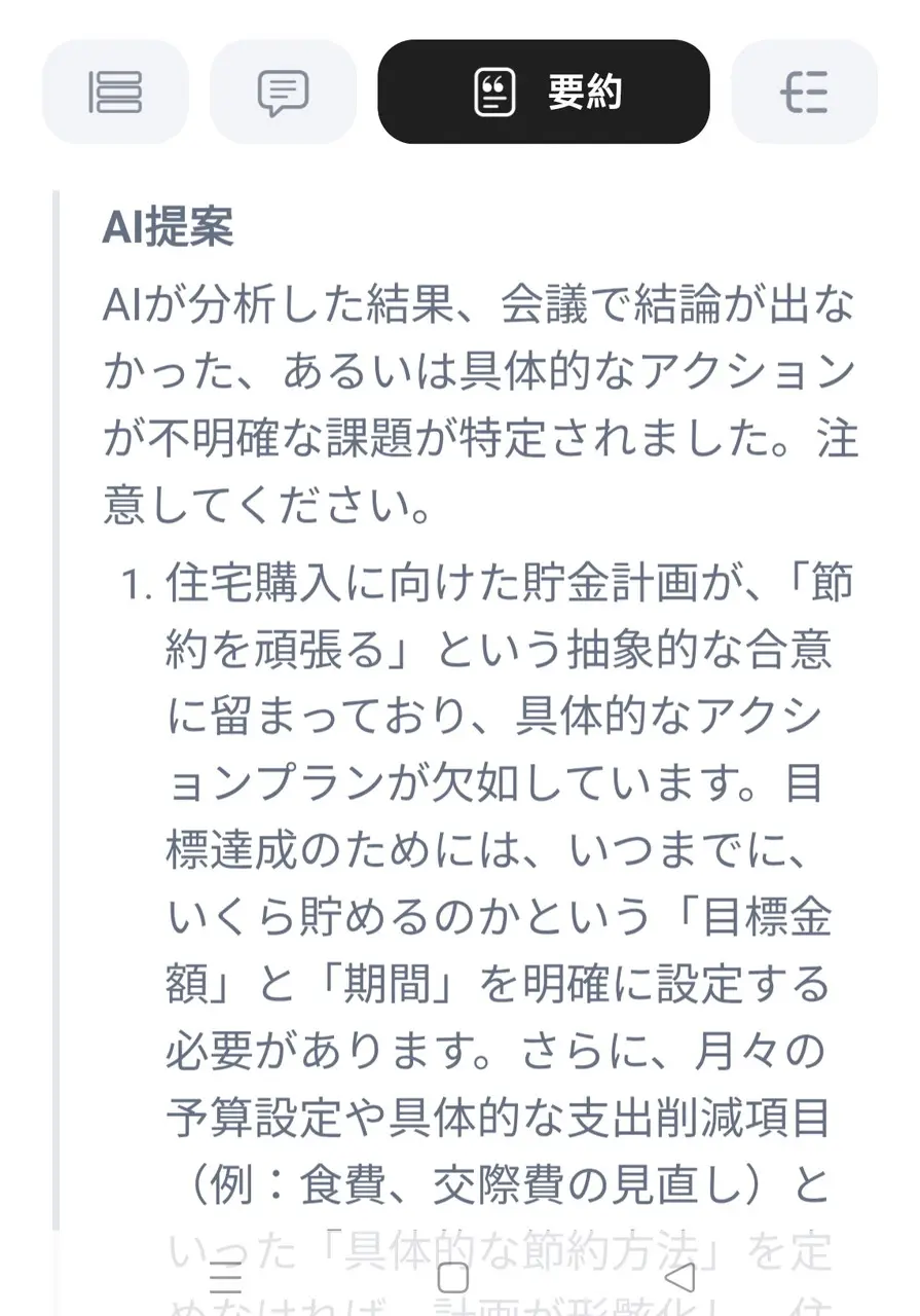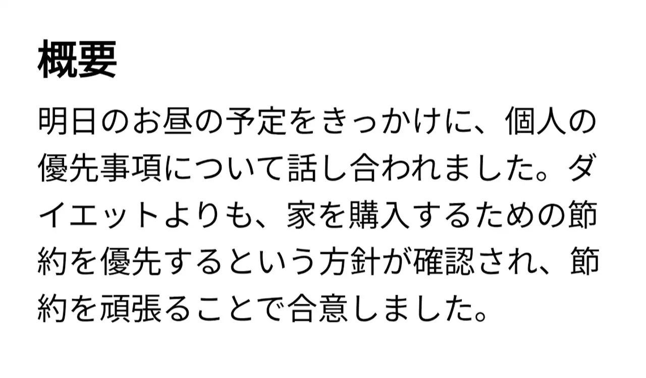 会話内容の主要トピックが、大見出し・小見出しに分かれて要約されます。キチンとポイントごとに分かれているため、会話内容を整理しやすくなっています。