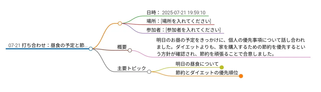 長い会話・会議になるほど、全体の内容を見返すことが困難になります。そのような場合に、このマインドマップは会話全体を俯瞰して見ることができる、実に便利なツールとして機能してくれるでしょう。