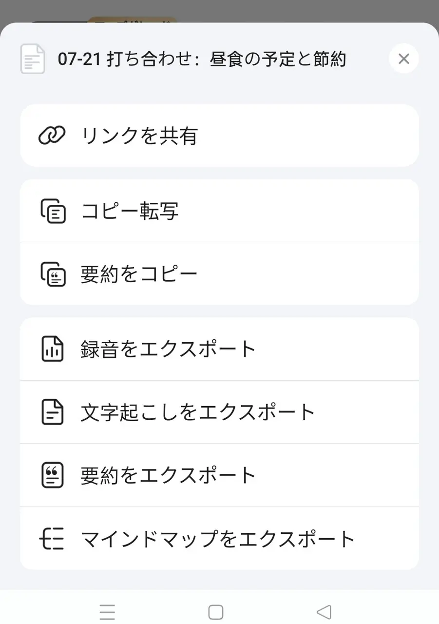 そして、録音データ、文字起こしデータ、要約データ、マインドマップデータを別々にエクスポート(出力)することも可能です。
