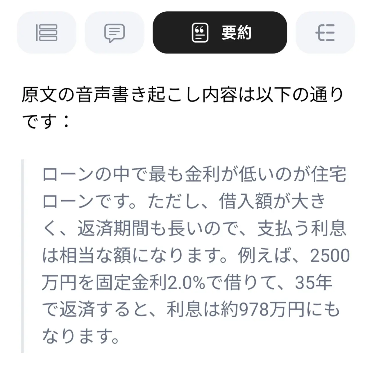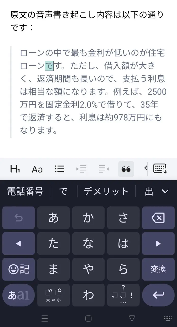 聴き取り精度はかなり高いと言えるでしょう。読点、句読点の位置も適切で、文字起こし内容は実に見やすいです。漢字や数字の書き方も問題なく、修正が必要は箇所は全くありませんでした。