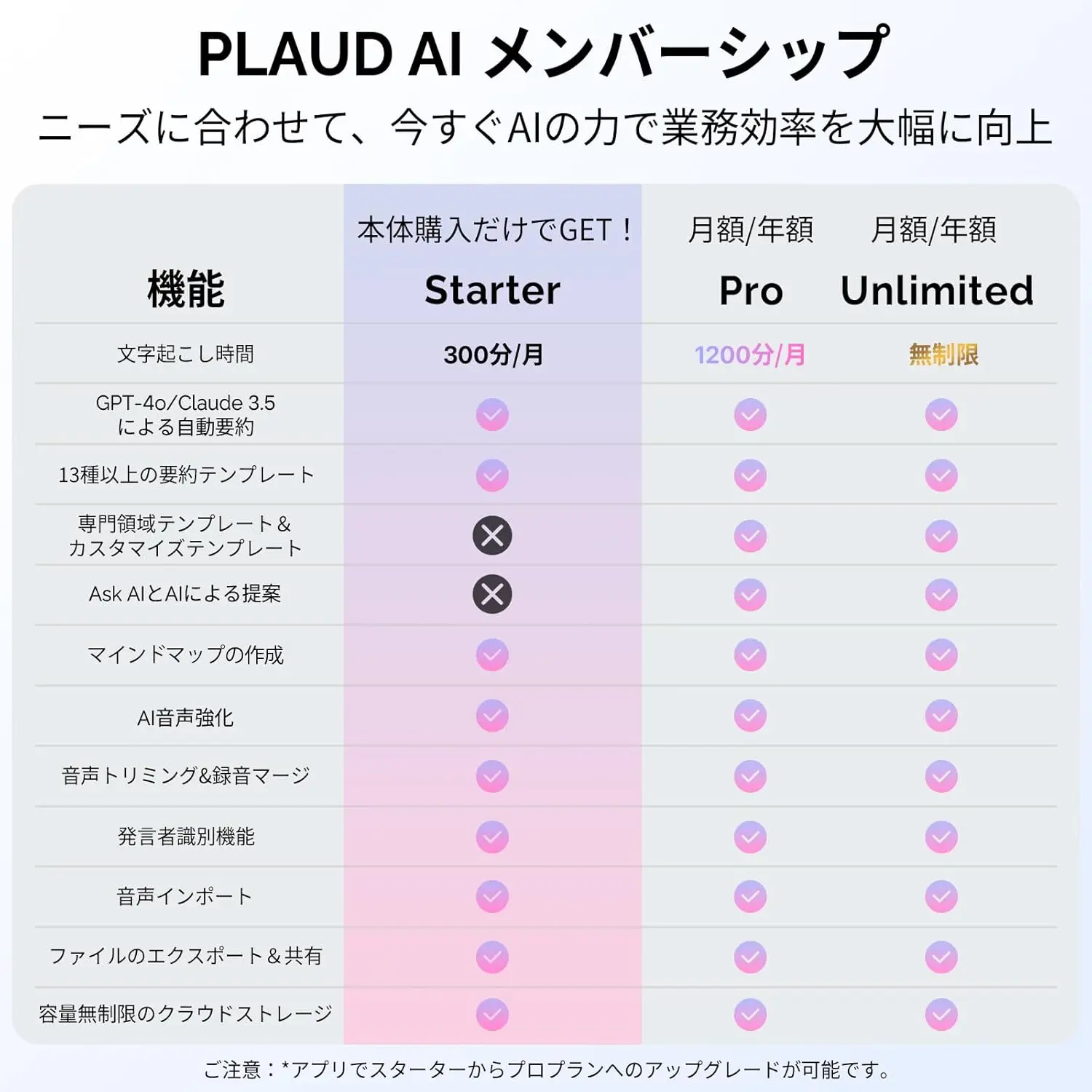 なお、製品には「高度AIスタータープラン無料(毎月300分間文字起こし)」が付帯しており、購入後すぐに高度なAI機能の数々を利用可能。