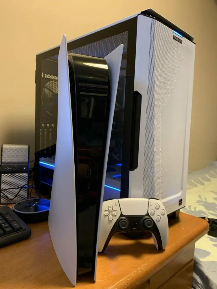 ▼ハイタワー型PC(画像右)との比較。いかにPS5が大きいかが分かる。