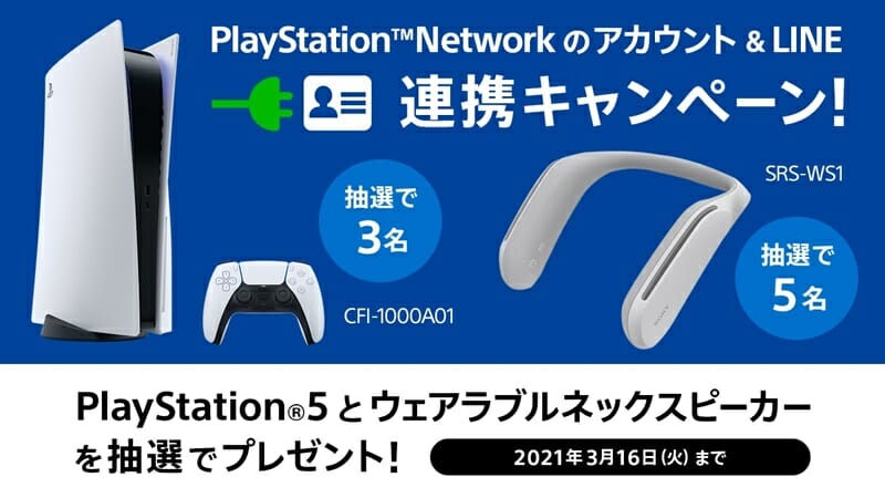 PSNのアカウントとLINEを連携すると、抽選で3名様にPlayStation®5を、5名様にソニー製ウェアラブルネックスピーカーをプレゼント!詳しくはこちら⇒ https://t.co/Le6qZzOc2i#PS5 pic.twitter.com/knh2pVaEAm