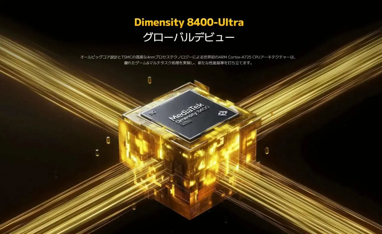 CPU(SoC)には「Dimensity 8400-Ultra」を採用。8GB / 12GB LPDDR5X RAMを搭載し、一般的なスマホ用途はもちろん、ゲーミング利用にも対応できる性能を備えている。