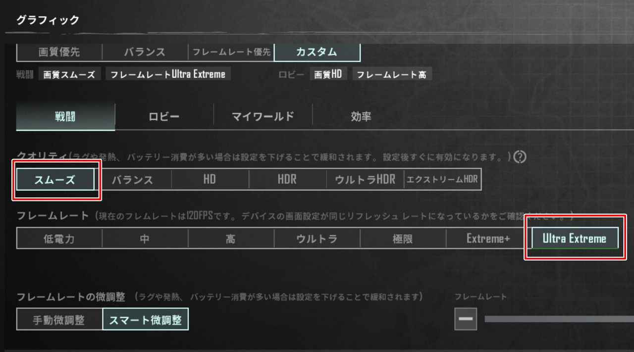 なお、画質クオリティを「スムーズ」に、フレームレートを「Ultra Extreme」に設定した場合、120fps前後の高フレームレートで安定してプレイすることが可能であった。