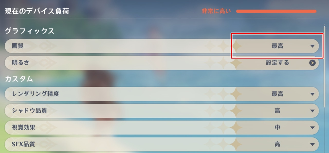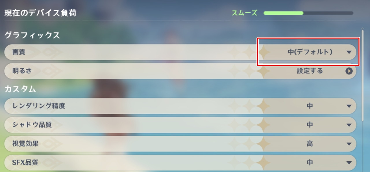▼画質設定はデフォルト状態で "中" に設定されており、デバイス負荷は "スムーズ" の状態。