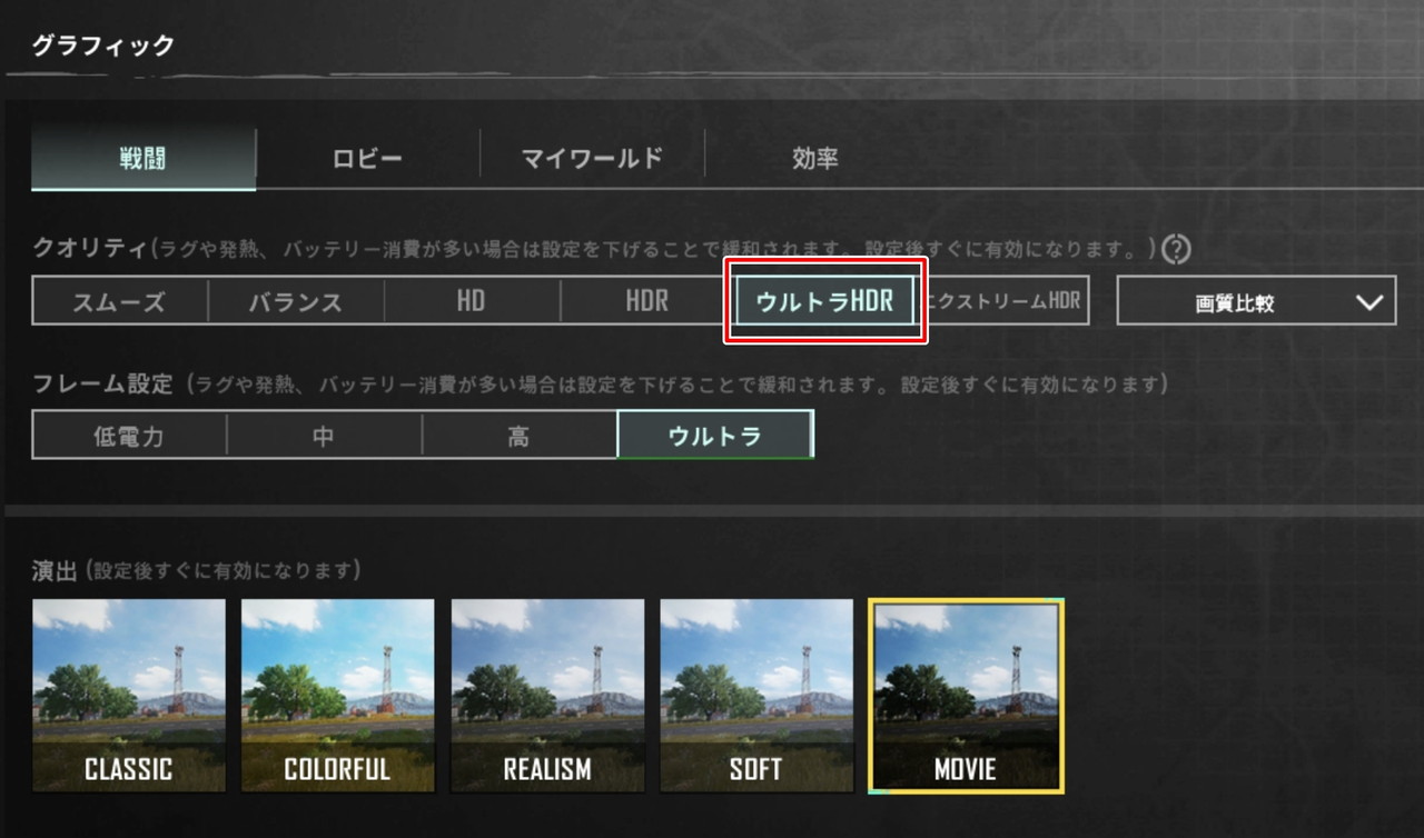 まずグラフィッククオリティに関しては、現時点で最高設定の『ウルトラHDR』を選択できた。
