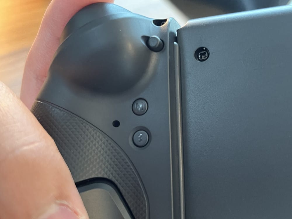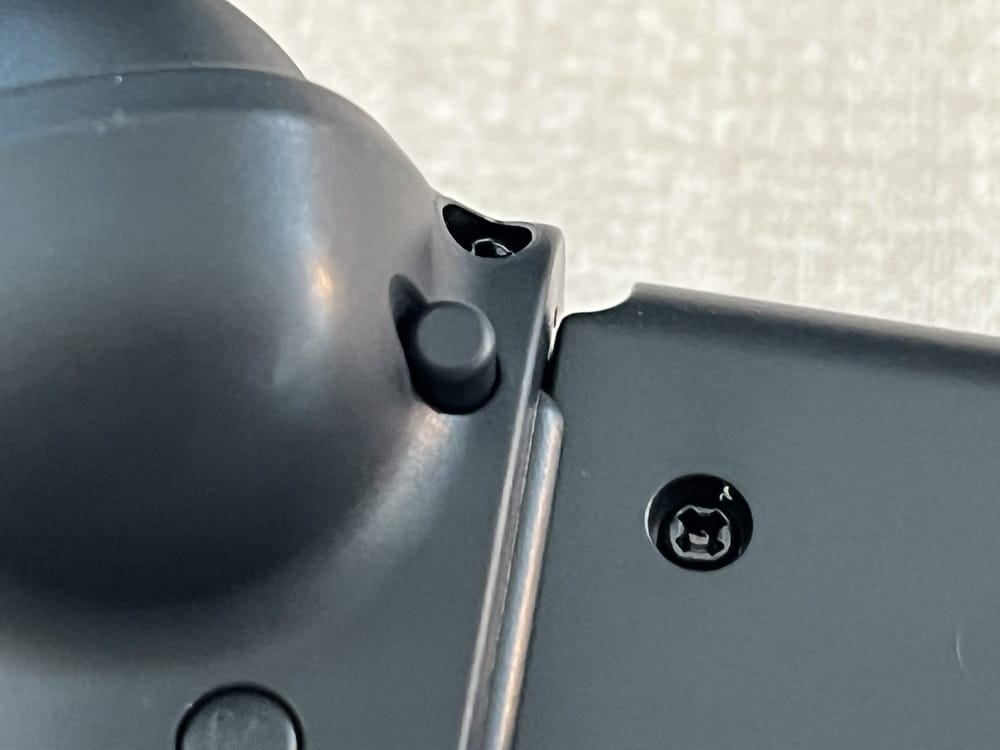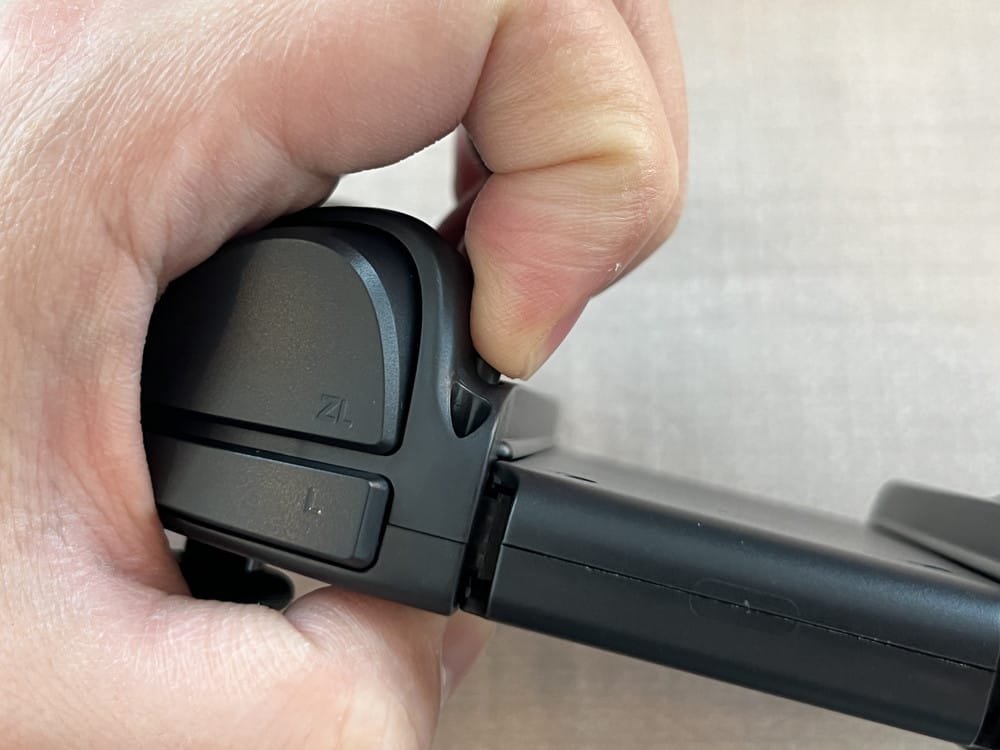 また、左右背面上部の小さなボタンを押しながらコントローラー左右を上方向にスライドさせることで、Joy-Conのように分離することができる。