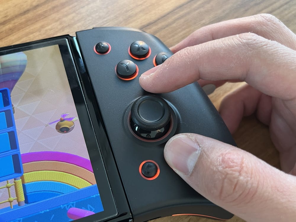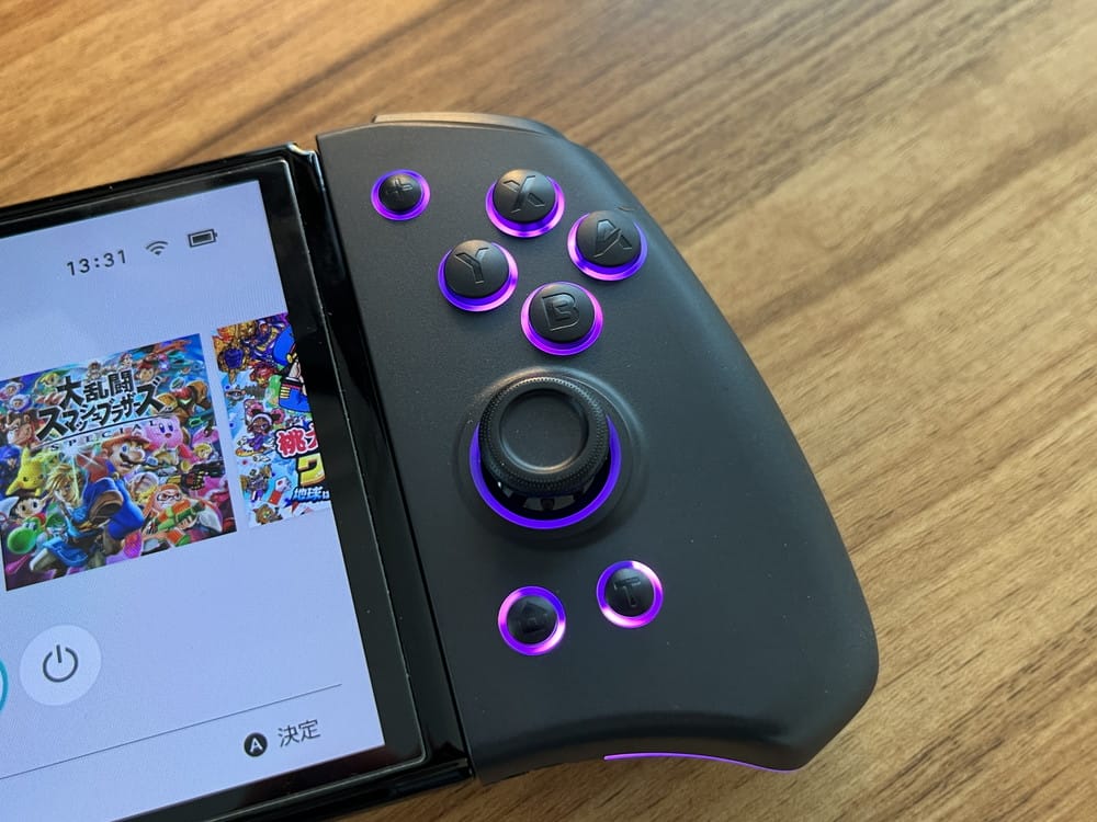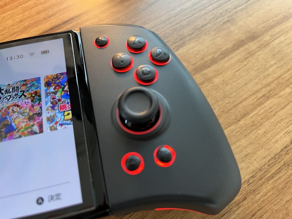 直接接続、ワイヤレス接続のいずれの場合でも、基本的に遅延やラグは感じられず、終始スムーズかつストレスのない操作が可能であった。アナログスティックやLRトリガーの感度も良好。純正Joy-Conと同等の滑らかさでゲームを楽しめる。ZR/ZLボタンも大きくて押しやすい。