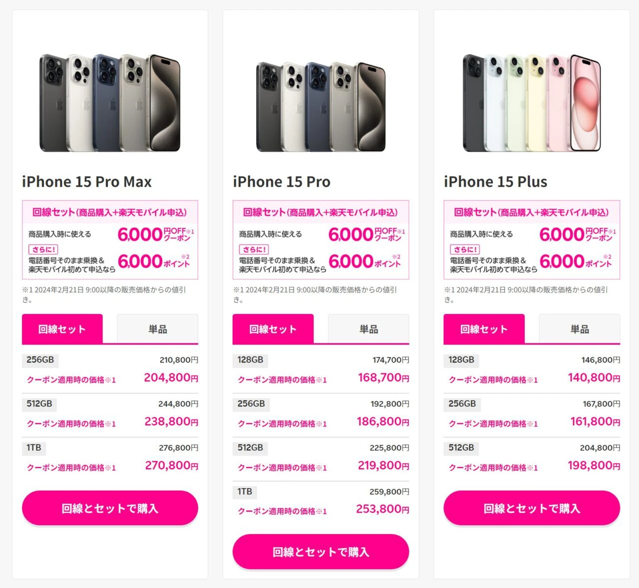 ▼参考:楽天モバイルにおけるiPhone15シリーズ販売価格(クリックで拡大)