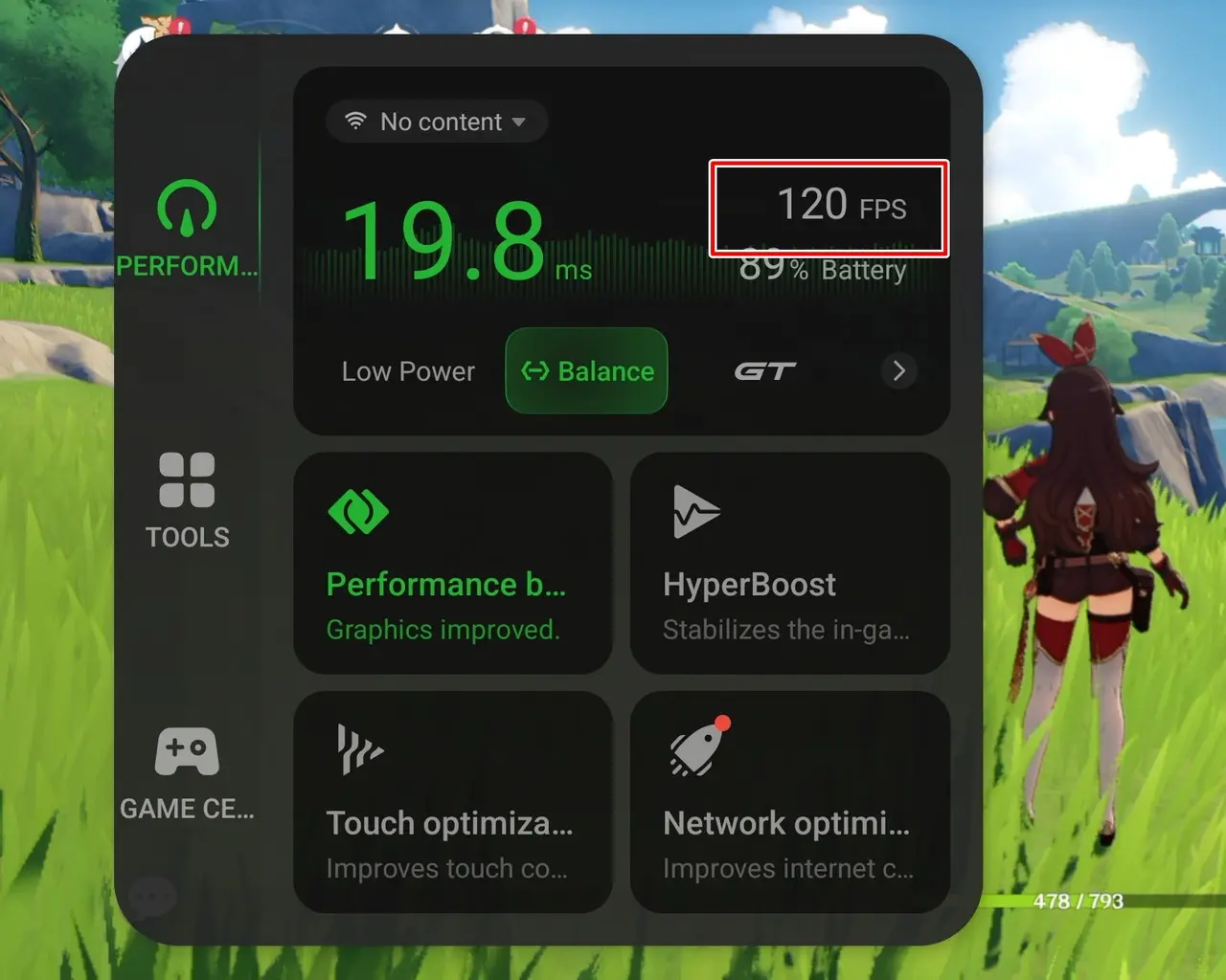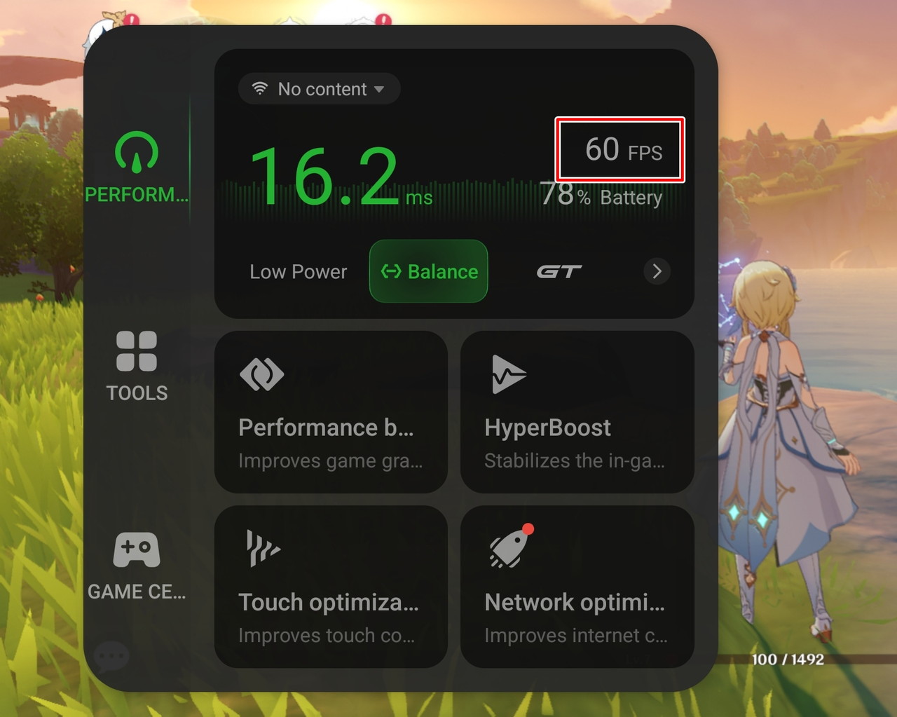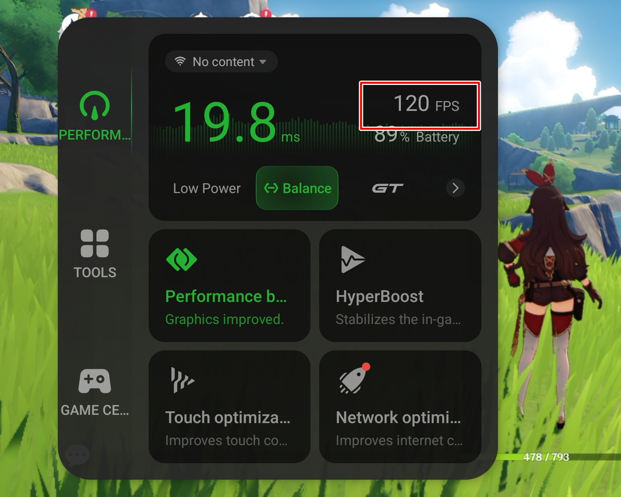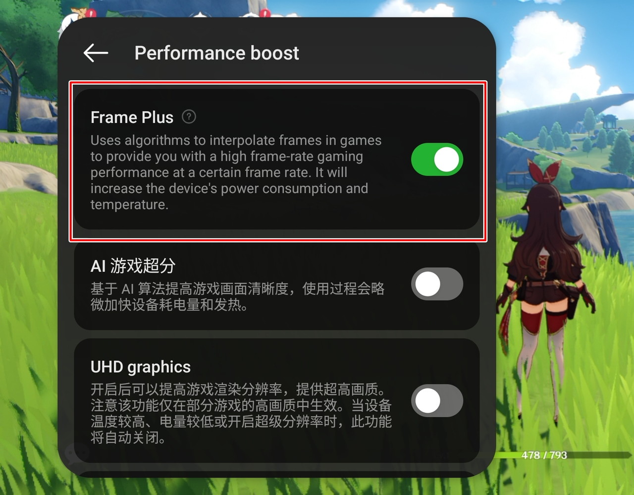 そして上記のツール画面から「Frame Plus」をオンにすることで、原神など一部の対応ゲームアプリにおいてフレーム補間が実行され、最高120fpsゲーミングが可能になる。