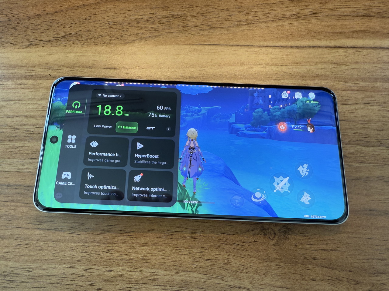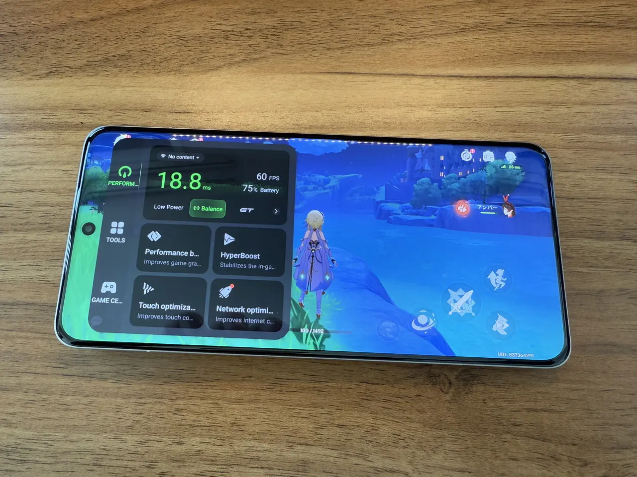 最新CPU(SoC)の「Snapdragon 8 Elite」を搭載することで、AnTuTuベンチマーク約275万点のハイパフォーマンスを実現。基本性能が非常に高く、動画視聴からウェブサイト閲覧まで、ほとんどのスマホ作業を快適にこなすことが出来る。また『原神』レベルの激重ゲームアプリでも、通常時で60fps前後安定、フレーム補間を利用すれば最高120fpsでスムーズに動作した。
