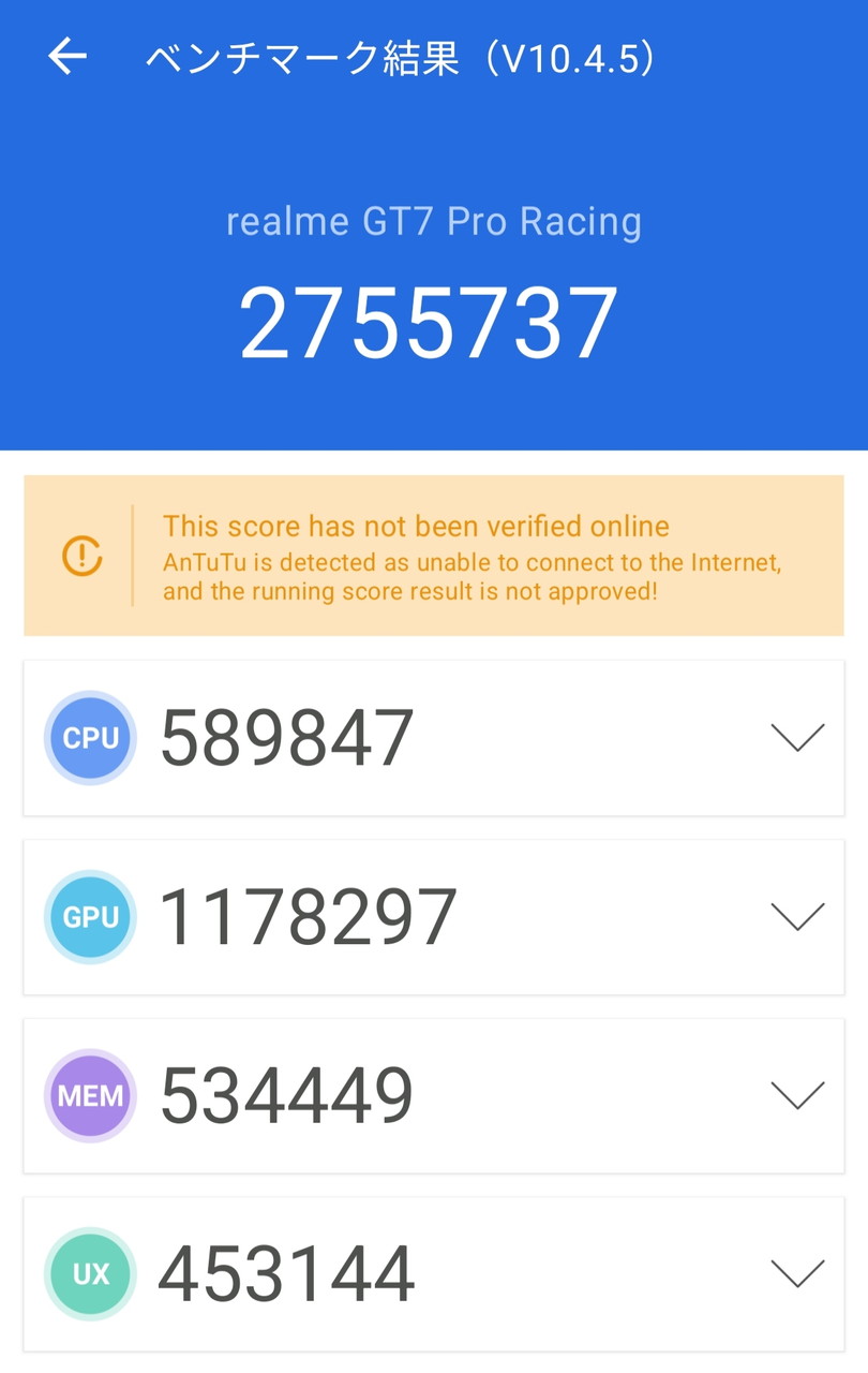 以前レビューした「OnePlus Ace 5 Pro」や「OnePlus 13」と同じくハイエンドSoCのSnapdragon® 8 Eliteを採用。上記2モデルはAnTuTuベンチマークテストにおいて260~280万点台(実測値)を叩き出したので、realme GT7 Pro Racing Editionも同様の高スコアが期待できる。