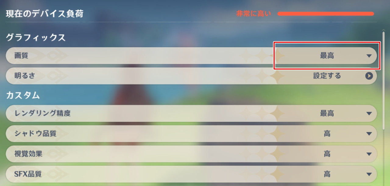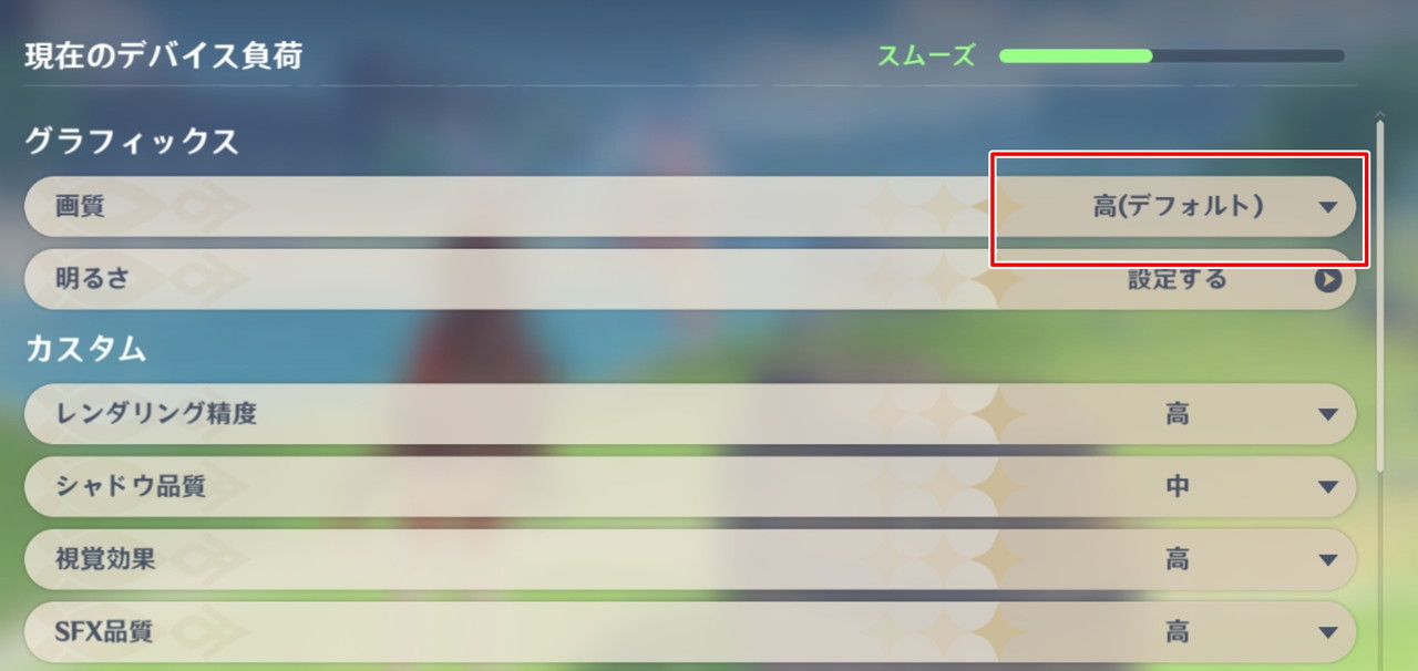 ▼画質設定はデフォルト状態で "高" に設定されており、デバイス負荷は "スムーズ" の状態。